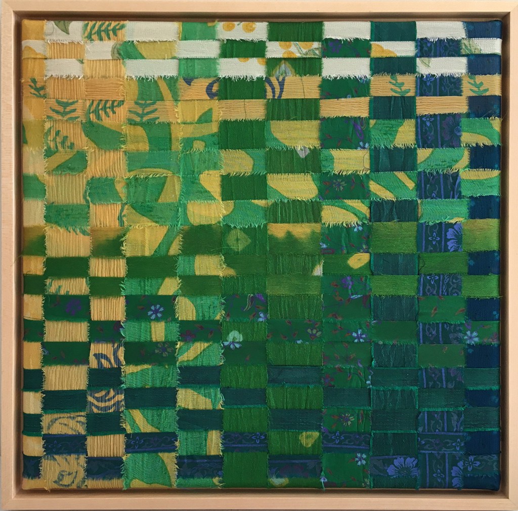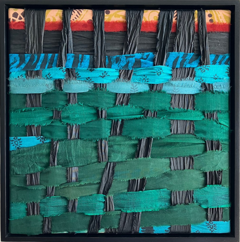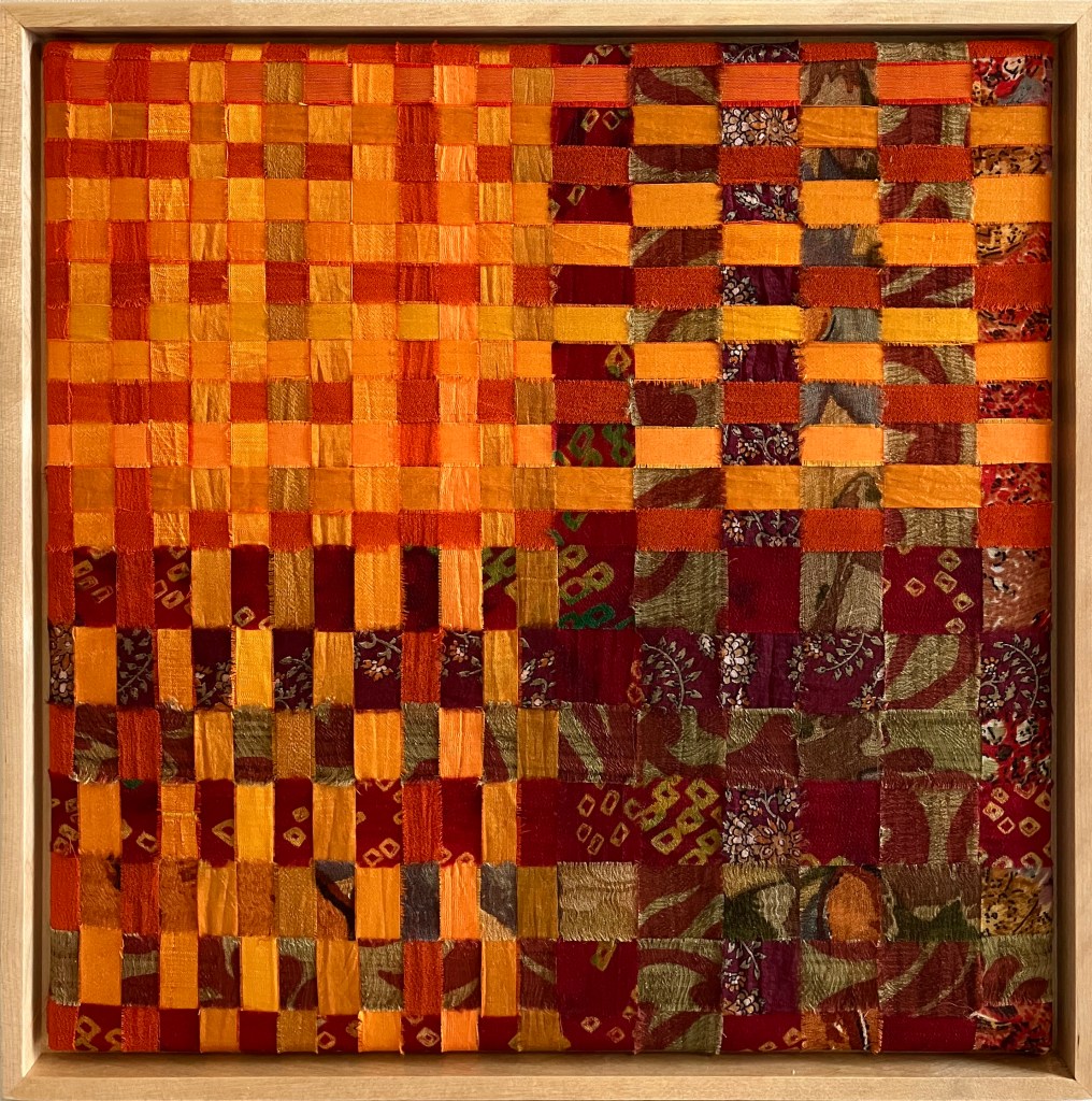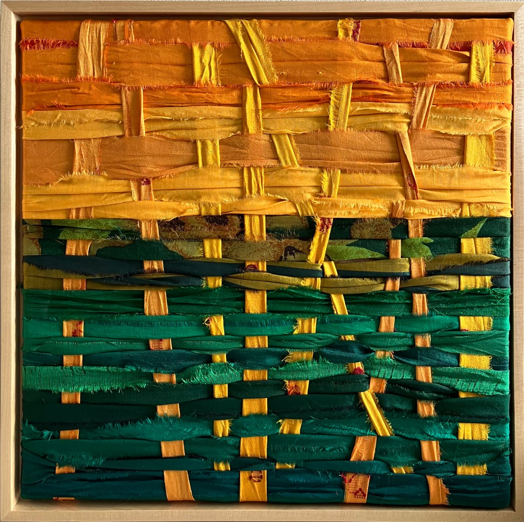 13″ squares The sari silk ribbons are woven over canvas and then a wood floating frame is added. Balance SOLD Meander Jubilation SOLD Into the Woods Moon Rising SOLD Pond Life SOLD Color Band Blue&Purple Midnight SOLD Chocolate and Caramel SOLD Watermelon SOLD Blackberries SOLD Gravity SOLD Squares and Rectangles SOLD Chaos & Calm SOLD Forest Night Sky SOLD Totem Sandstone SOLD Fire back of Fire Confetti SOLD Cantaloupe SOLD Harvest SOLD Grassland SOLD Related